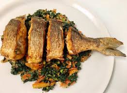 with choice ofAn abundance of fresh leafy vegetables simmering with smoked fish fillets, grounded Prawns in a mildly spicy sauce.